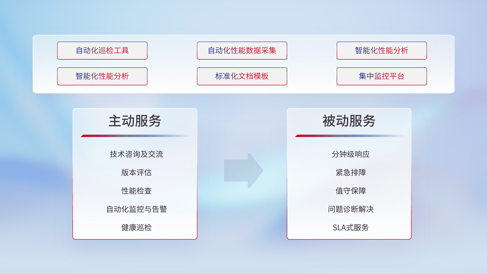智能化工具和标准化文档,,,,保障服务质量,,,,提供主动服务(包含技术咨询、、版本评估、、、性能检查、、、自动化监控与告警、、、、健康巡检)和被动服务包含(分钟级响应、、、、紧急排障、、值守保障、、、、问题诊断解决、、、、SLA服务)。。